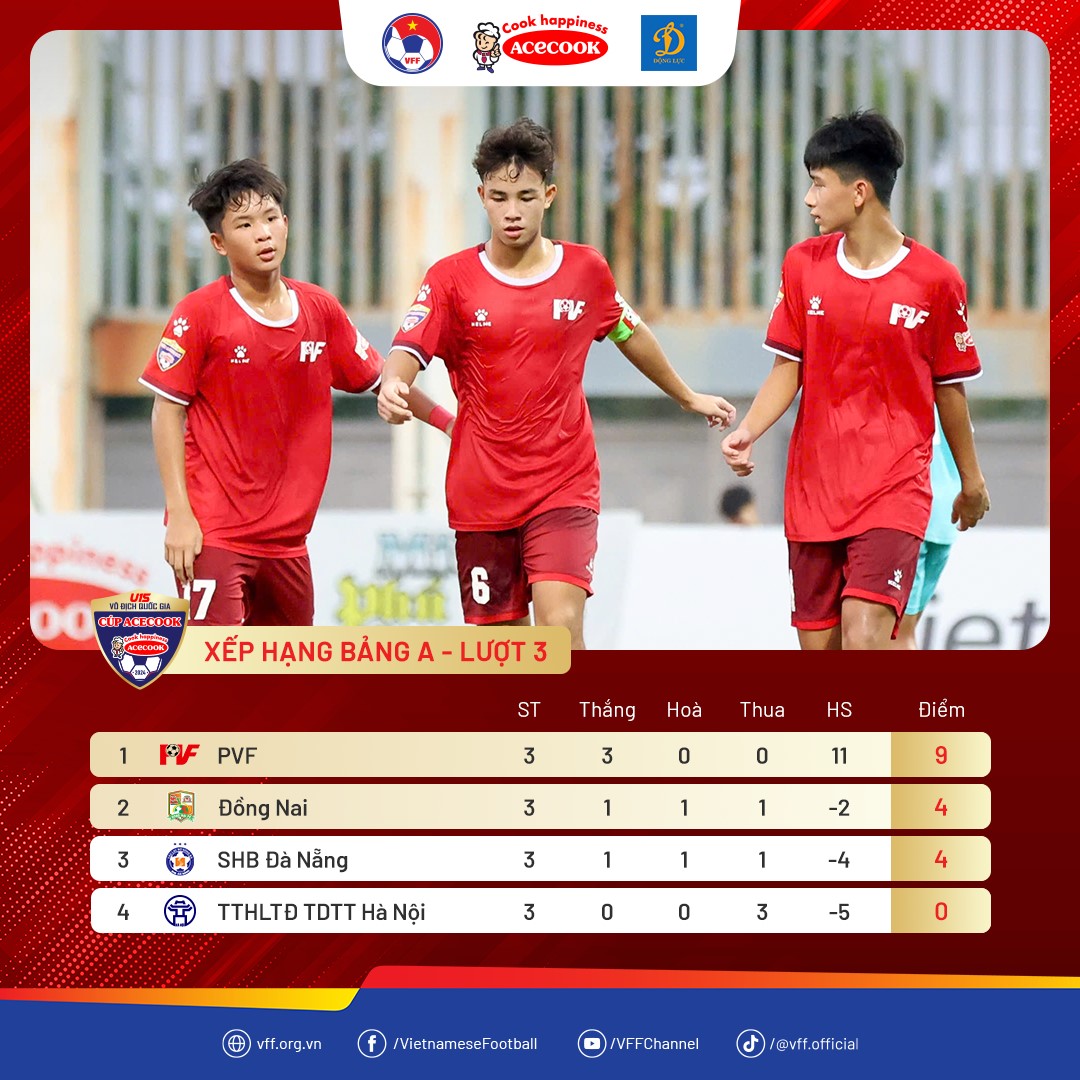 Kết quả cuối cùng xếp hạng 3 bảng đấu tại VCK U15 Quốc gia 2024 (Ảnh: VFF):