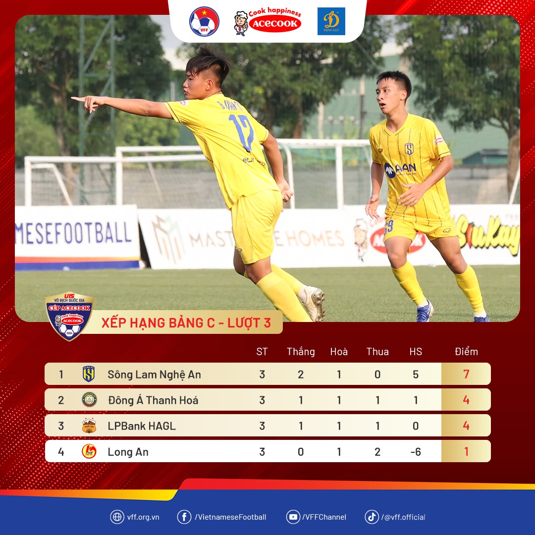 Như vậy, VCK U15 Quốc gia 2024 từng xác định được 8 cái tên đi tiếp: bảng C có 3 đội gồm SLNA, HAGL kèm theo Đông Á Thanh Hóa. Bảng B có 2 đại diện gồm Thể Công Viettel lẫn cả Bà Rịa Vũng Tàu. Bảng A có SHB Đà Nẵng, PVF với Đồng Nai.